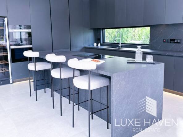 The villa comes fully furnished, featuring spacious bedrooms and luxurious bathrooms, perfectly suited for refined family living. Outdoors, a tranquil setting awaits with a stunning infinity pool, creating a private oasis ideal for relaxation and entertaining. This exceptional property blends modern design with serene island living, making it a perfect choice for those seeking both luxury and comfort.